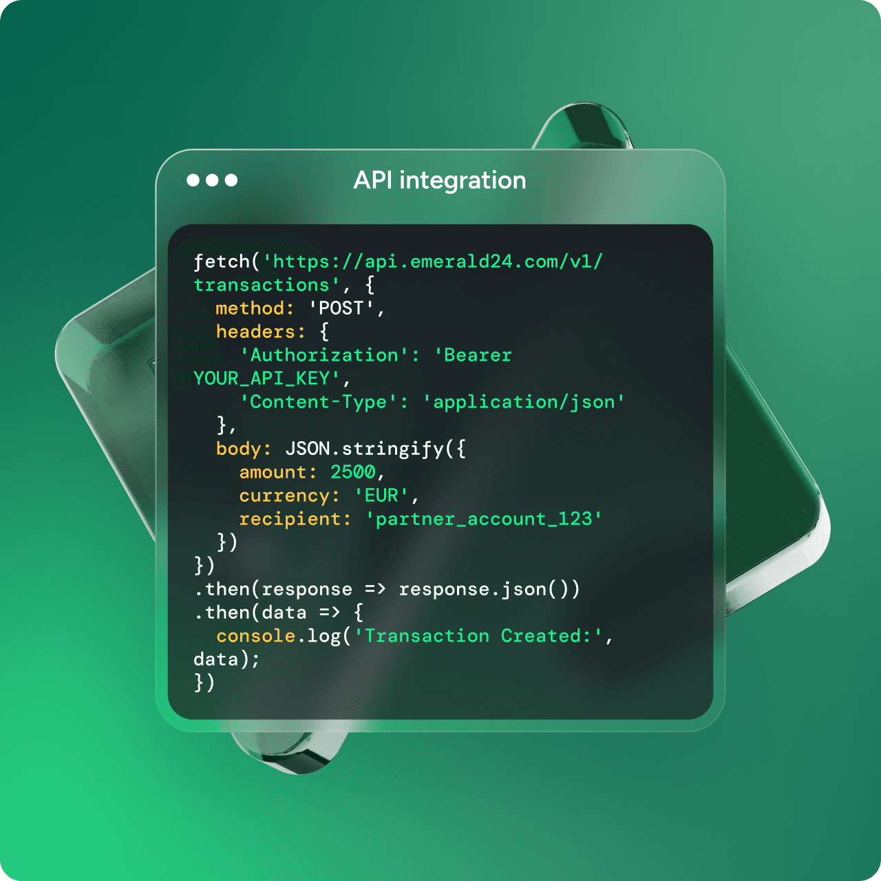 Launch your own branded fintech platform powered by Emerald24’s infrastructure. Offer accounts, cards, payments, and FX under your brand with full control, quick time-to-market, and ongoing support.